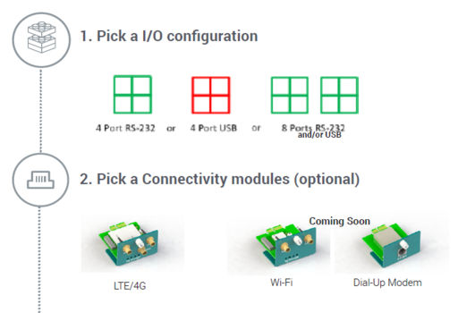 | Interfaces | Dual Gb Ethernet or Dual Gb fiber SFP ports, Front Panel: Two (2) customer replaceable IO module slots for 4 port RS-232 (RJ45) 300 to 921600 bps, 4 port USB or 4 port Ethernet Switch, Two (2) customer replaceable connectivity module slots for LTE/4G cellular, Wi-Fi, or dial up modem out-of-band options, USB Host port, microSD/SDHC slot, RS-232 console |